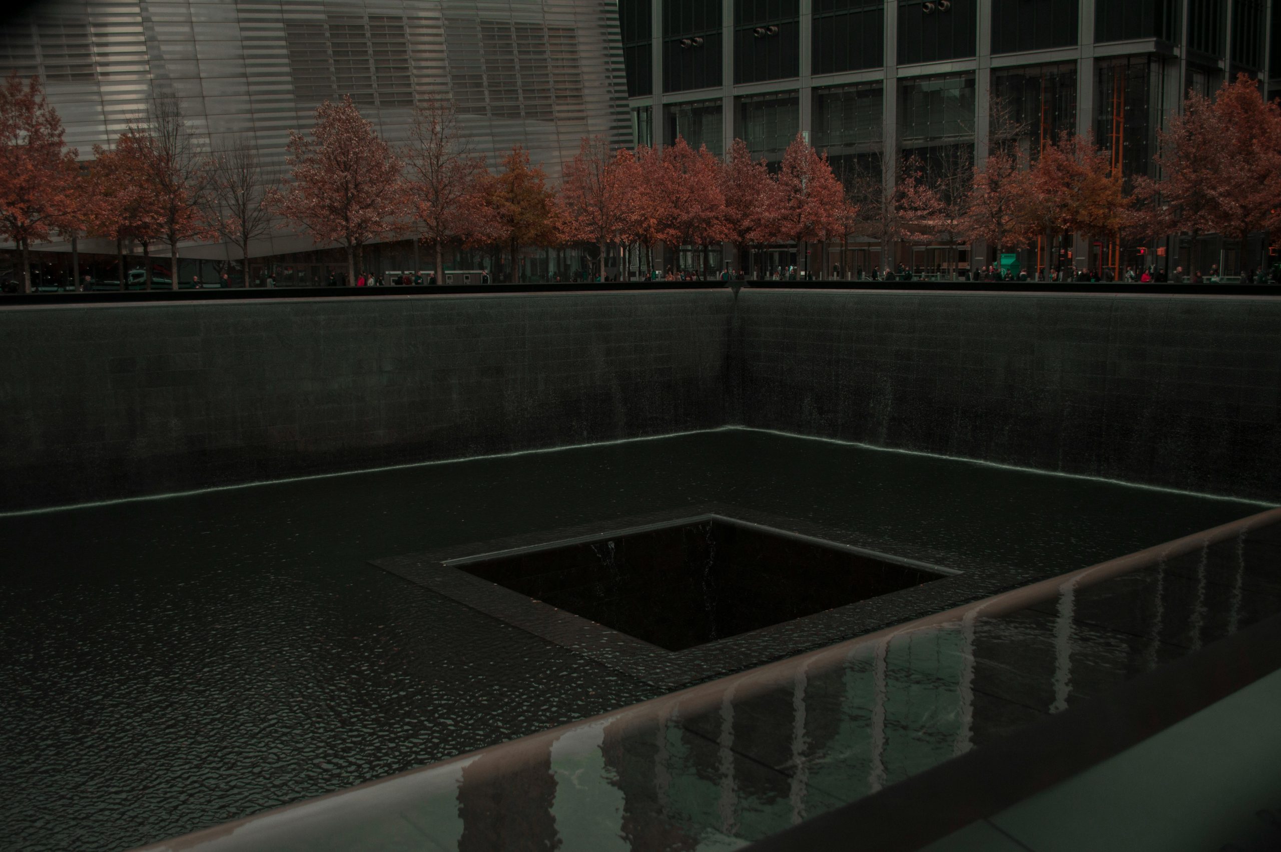 Somber view of the 9/11 Memorial Pool with autumn trees and urban backdrop.